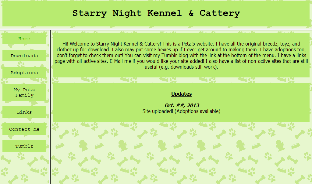 During my sophomore year of high school (2013) I started getting into petz again. That's when I started on Maddilyn's Munchkins. I had a Tumblr by that name too, so even though the site never made it online I still had somewhat of an online presence in the pc. I got sick of that name pretty fast though and changed it too Starry Night K&C, though I can't remember if I ever changed the Tumblr. Pretty much all of this happened during christmas break, and once school started I got busy and lost interest. I ended up deleting the Tumblr.